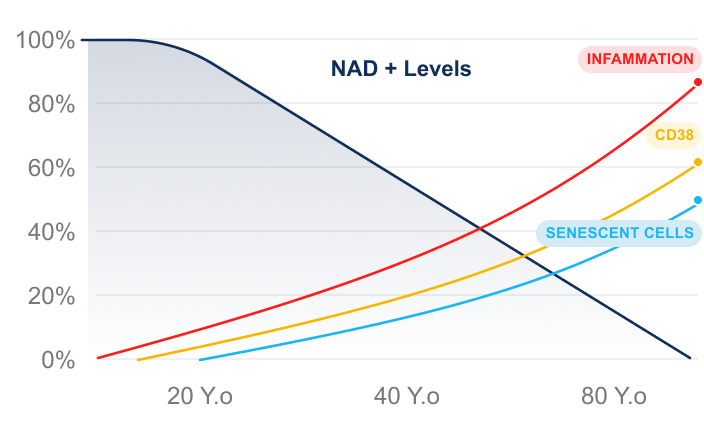 As your NAD+ levels decrease symptoms of feeling older increase.