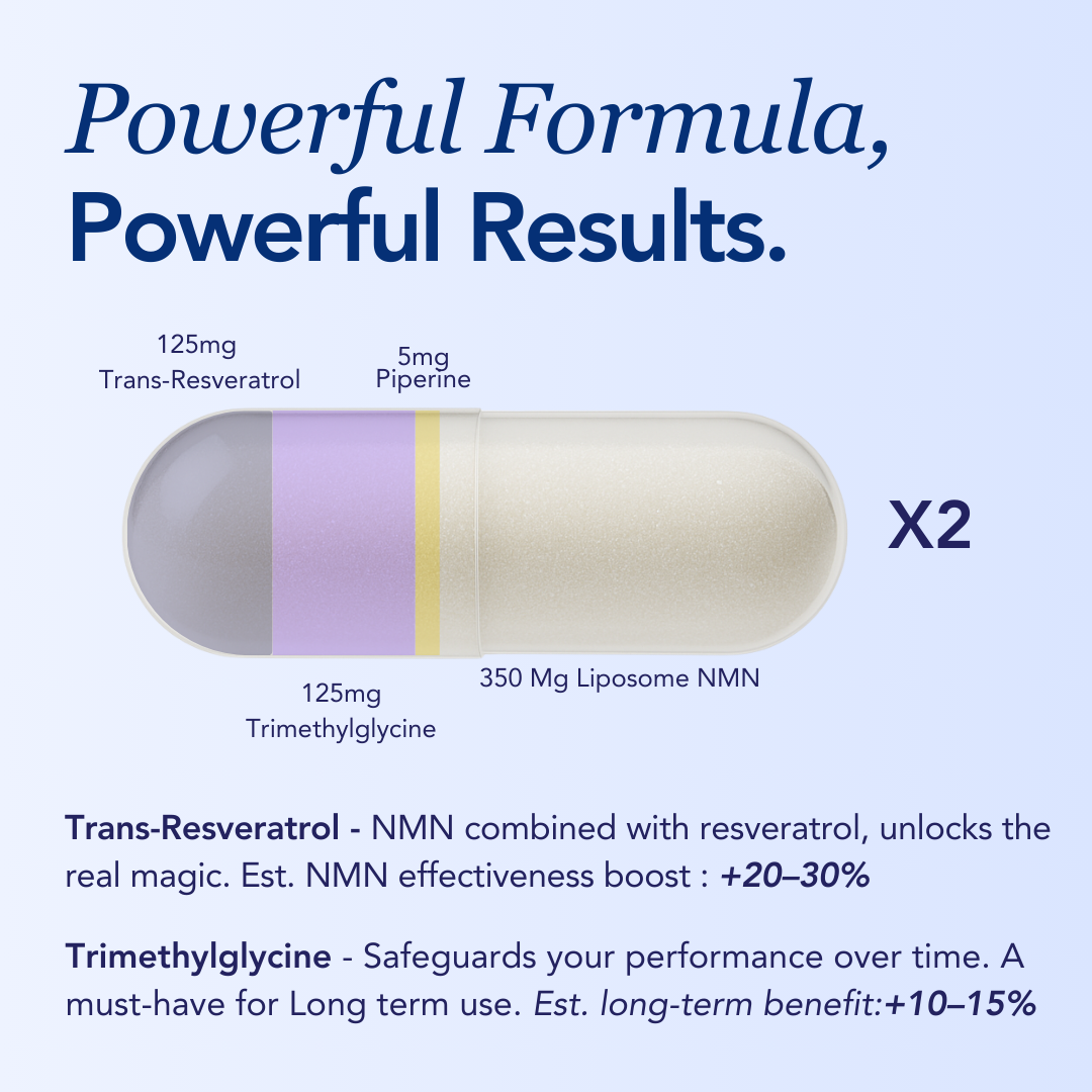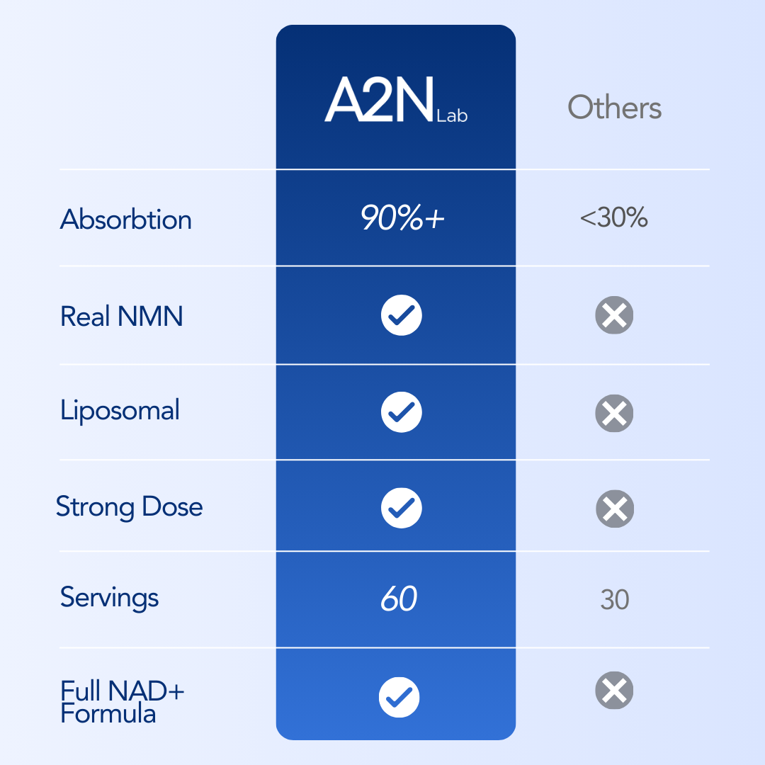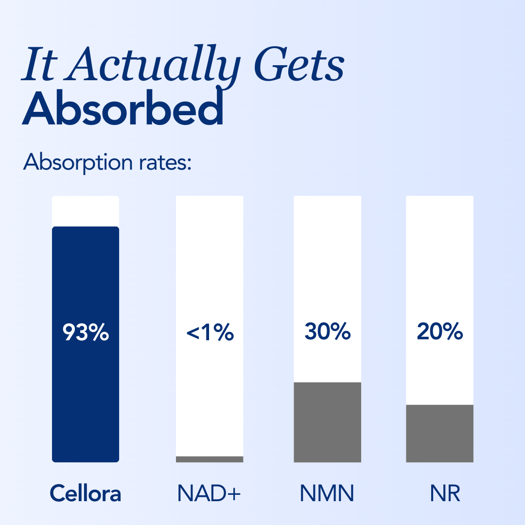 NAD⁺ supplements have under a 1% absorption rate. Standard NMN? Only 30% the other 70% is lost in the gut. That means regular supplements do almost nothing for your cells.