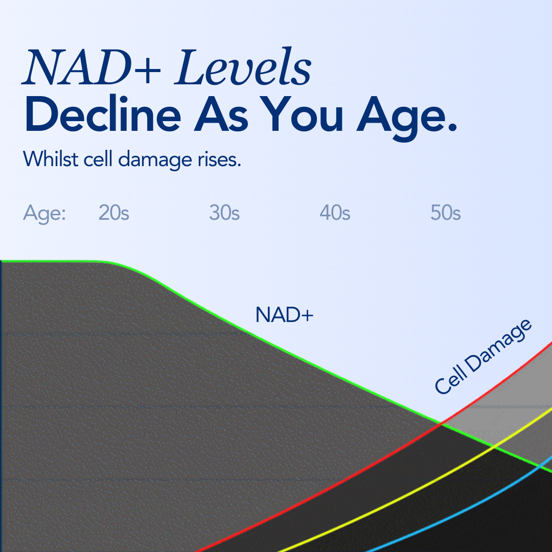 As your NAD+ levels decrease symptoms of feeling older increase.