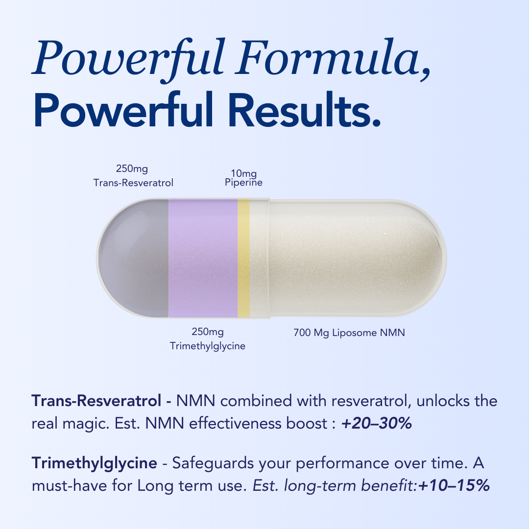 Many experts believe NMN is a more direct precursor to NAD+ than NR (Nicotinamide Riboside), meaning it may convert more efficiently in the body. Additionally, our NMN is liposomal for enhanced absorption up to 90%, which gives it a significant edge over standard NR.
